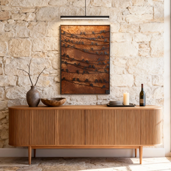 Birds on Wire a minimalist, rectangular metal frame showcasing a row of stylized birds perched on slender “wires.” The rustic, weathered finish imparts a timeless charm, while the clean silhouettes create a serene tableau. Perfect for accenting modern interiors, hallways, or cozy nooks with natural grace and subtle texture.