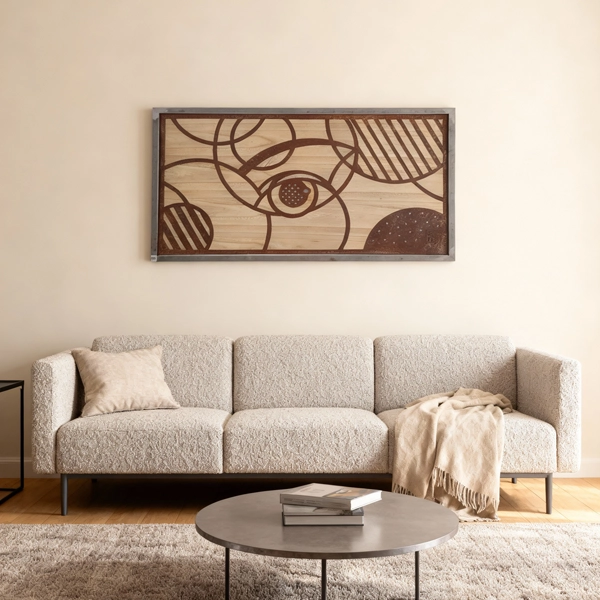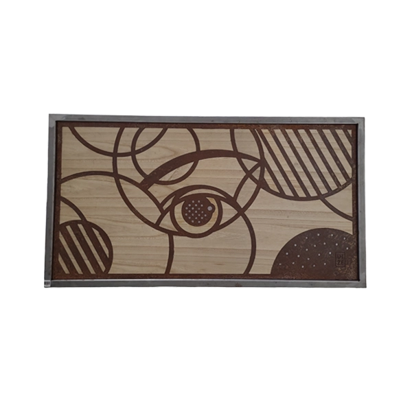 Eye a striking wall art piece combining wood and metal, featuring a stylized eye crafted with clean, geometric lines. The warm tones of the wood contrast beautifully with the industrial metal details, making it a symbolic and modern statement for any contemporary space.