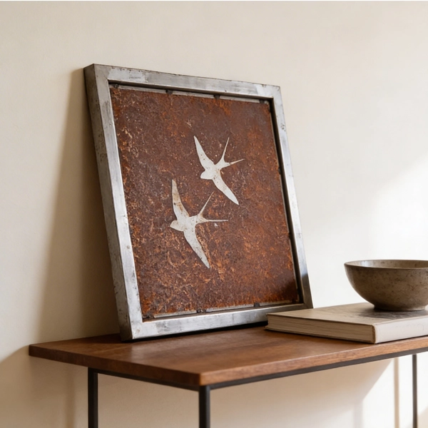 Flying Together a beautiful rustic metal wall art piece depicting two birds flying side by side, symbolizing unity and companionship. The textured, weathered finish adds warmth and character, making it perfect for cozy homes, mountain lodges, or nature-inspired interiors.